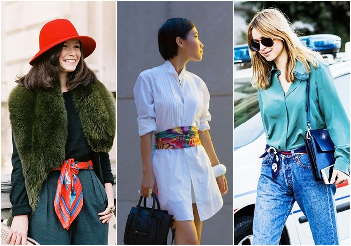 Bạn có thể thắt khăn quanh áo đầm, luồn vào đai quần để tạo thành thắt lưng hoặc buộc quanh nón thành một sợi ribbon duyên dáng. Chắc chắn việc điểm thêm một chiếc khăn lụa ở vùng thắt lưng sẽ tạo điểm nhấn ấn tượng cho cả outfit.