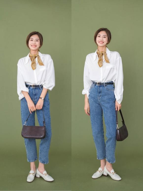 Với outfit quần jean và áo sơ mi đơn giản, năng động hàng ngày, chị em hãy buộc thêm một chiếc khăn choàng cổ để trang phục thêm phần bắt mắt, nổi bật hơn.
