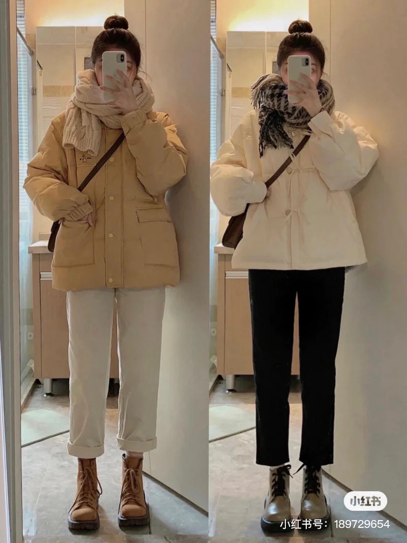 Nàng có thể thử ngay kiểu phối đồ mùa đông đầy cá tính với áo phao dáng ngắn tông trắng, tạo nét trẻ trung khi kết hợp cùng quần jean ống suông màu đen. Outfit sẽ trở nên trông rất hoàn hảo khi được tạo điểm nhấn bằng khăn quàng họa tiết kẻ ô cùng kiểu tóc búi củ hành. Một đôi boots màu kem sẽ hoàn thiện outfit, vừa năng động lại duyên dáng, cực kỳ phù hợp cho chị em trong những ngày lạnh.